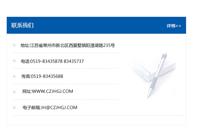 地址:常州市新北區友邦商務大廈1幢16、17層  電話:0519-85101652  傳真:0519-85112595  郵編:213022  網址:www.cz-jiayue_cn.danmichina.com  郵箱:xiajifengaa@163.com